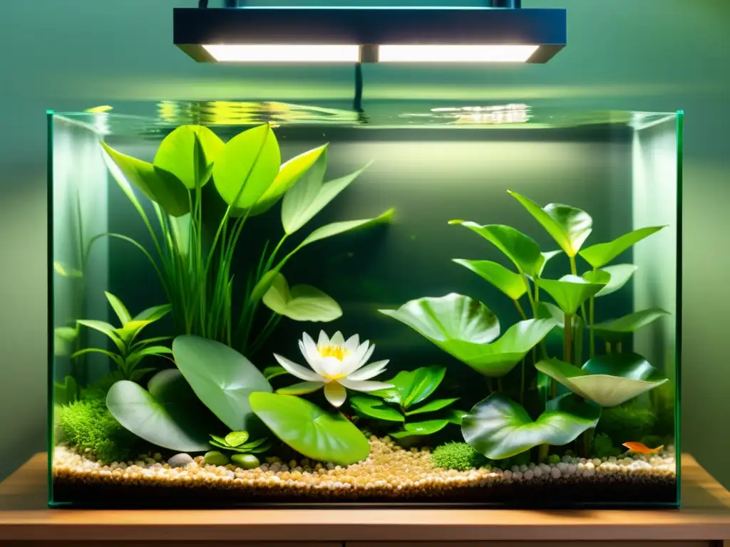 Un tranquilo jardín acuático interior con pecera de vidrio, plantas acuáticas verdes, peces dorados y luz natural